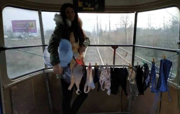 Молодая одесситка зашла в трамвай с полным тазиком нижнего белья, растянула на задней площадке бельевую верёвку и стала развешивать «кружевные трусы», попросив других пассажиров трамвая подержать тазик.