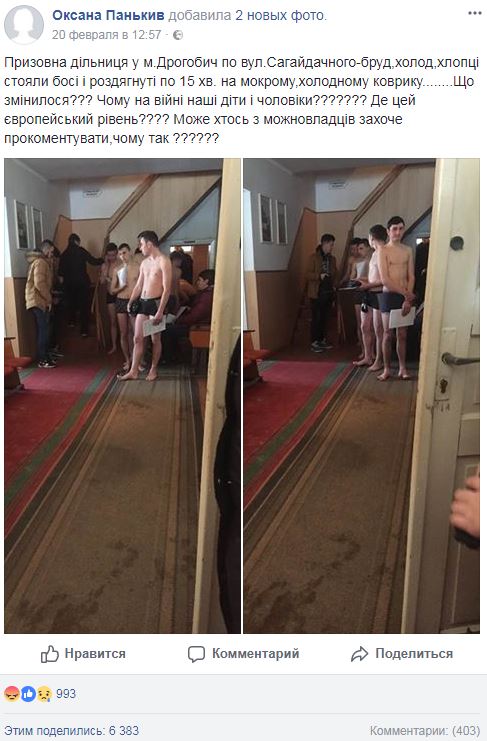 «Призывной участок в г. Дрогобыч по ул. Сагайдачного – грязь, холод, ребята стояли босые и раздетые по 15 мин. на мокром, холодном коврике. Что изменилось? Почему на войне наши дети и мужчины? Где этот европейский уровень? Может кто-то из чиновников захочет прокомментировать, почему так?» – написала Оксана Панькив.
